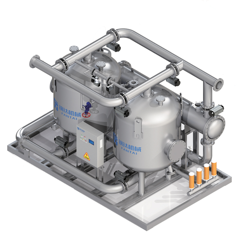 - FYP型壓縮熱再生吸附式壓縮空氣干燥機是利用空氣壓縮過程產主的熱量對吸附劑進行再生 ,然后需要~1-3%的凈化壓縮空氣減壓進行冷卻,這樣設計的目的是利用壓縮空氣系統自身的熱源使吸附劑得到充分脫附,確保露點溫度在滿足用戶要求的基礎上